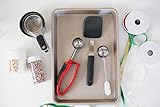 Deep elonggated handles for easy scooping the measuring spoons and cups are designed with innovative roundshaped heads the rounded bowls are easy to fill with dry and liquid ingredients and the spoons long comfort grip handles will fit easily most container openings