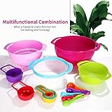 Versatile kitchen must great cooking prep set with nice box package is great for housewarming gift new home cooks bakers rv camping fruits vegetables basket flour mixing making bread dough home baking and small kitchens Diverse mixing measuring bowls set includes 15 pieces2 mixer bowls 1 colander 1 mesh strainer sifter 6 measuring cups 5 measuring spoons all made of durable healthy free plastic